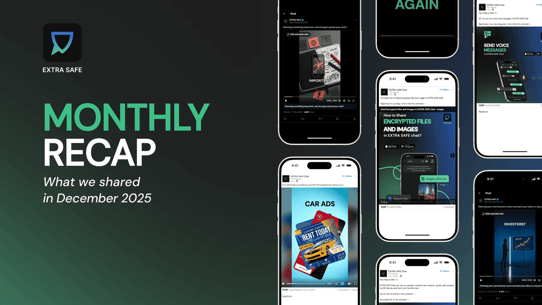 A monthly recap of everything EXTRA SAFE shared in December 2025, from new encrypted features and major growth milestones to privacy insights, security alerts, and real-world scenarios that show why private communication matters.