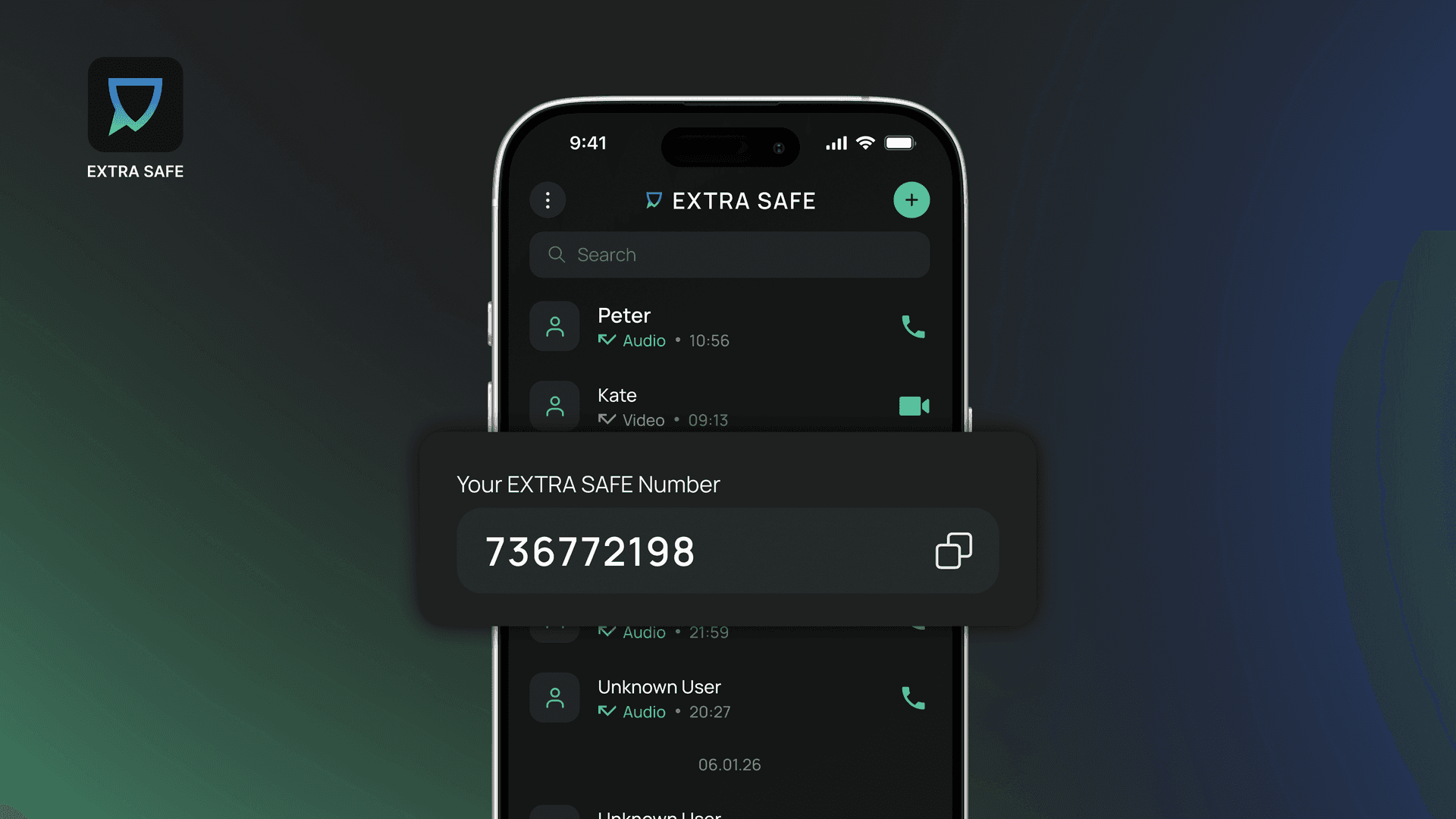 In the mobile app, you get an EXTRA SAFE number that you can use as your in-app identity. This 9-digit number is linked to your cryptographic setup and can be shared with others to enable call and message reception.