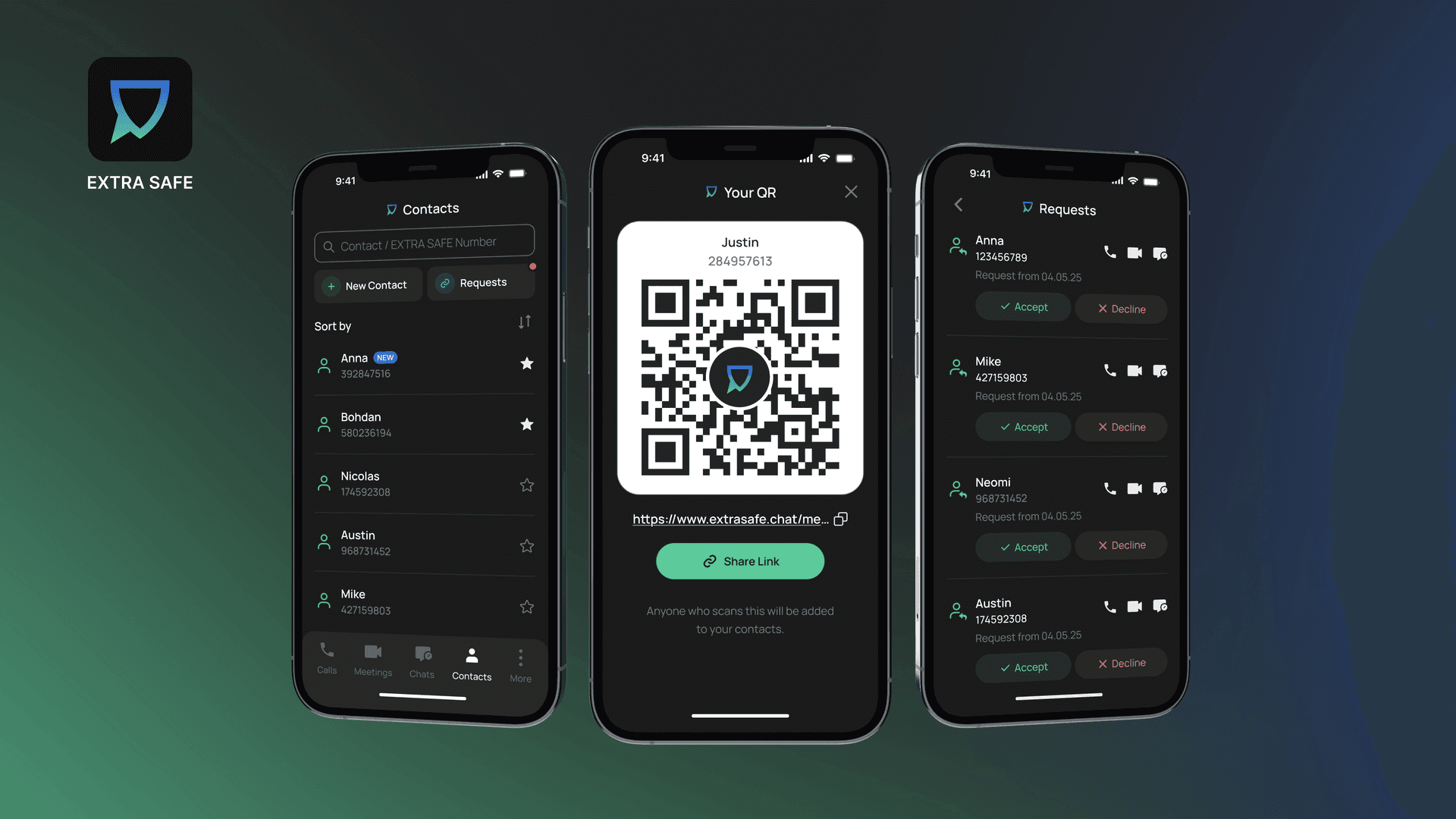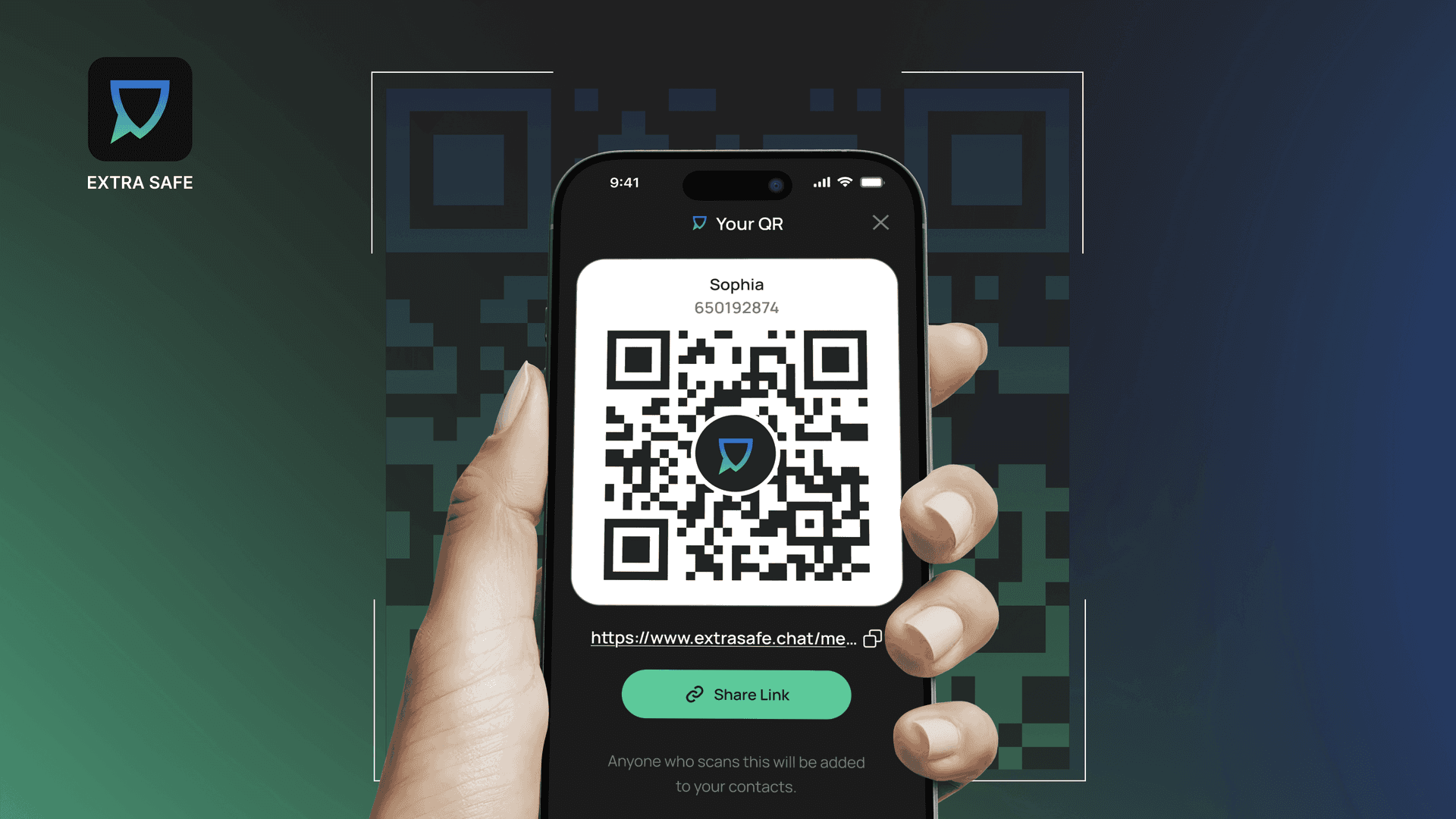 You can now share your contact through a QR code, a shareable link to your contact details, or your EXTRA SAFE Number. When the person opening your QR code scans it, your contact is added to their contacts list right away, and you receive a contact request to approve.